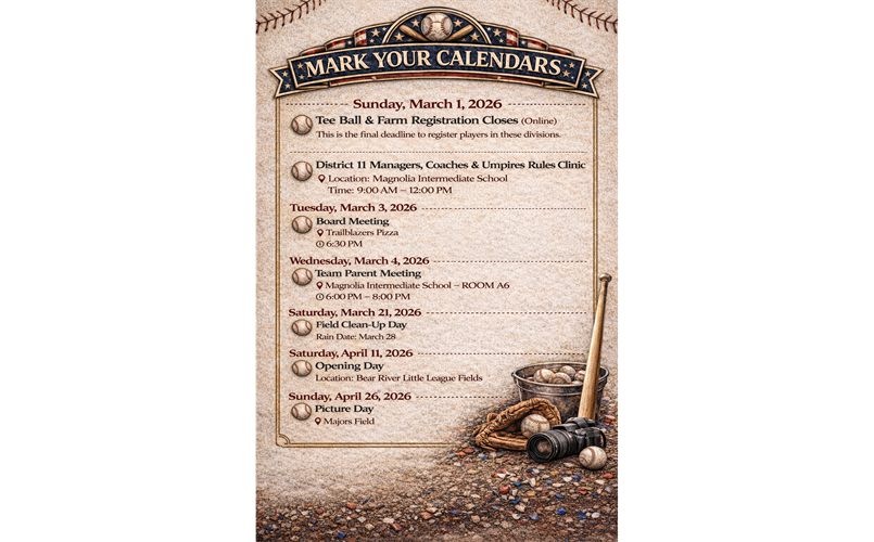Bear River Little League is excited to officially kick off the 2026 Spring Season on Saturday, April 11, 2026, beginning at 8:00 AM at the Bear River Little League Fields.